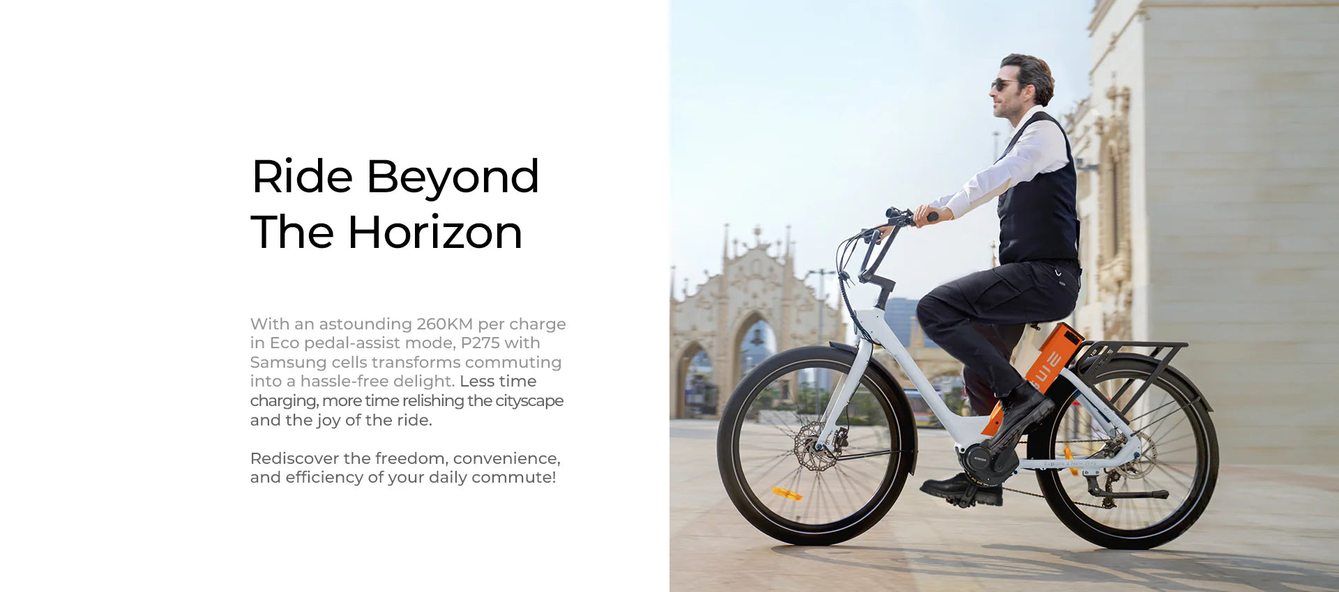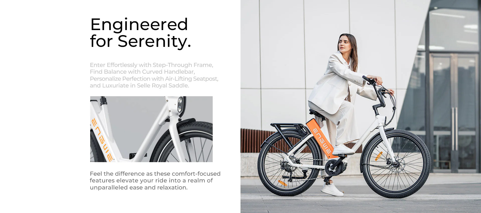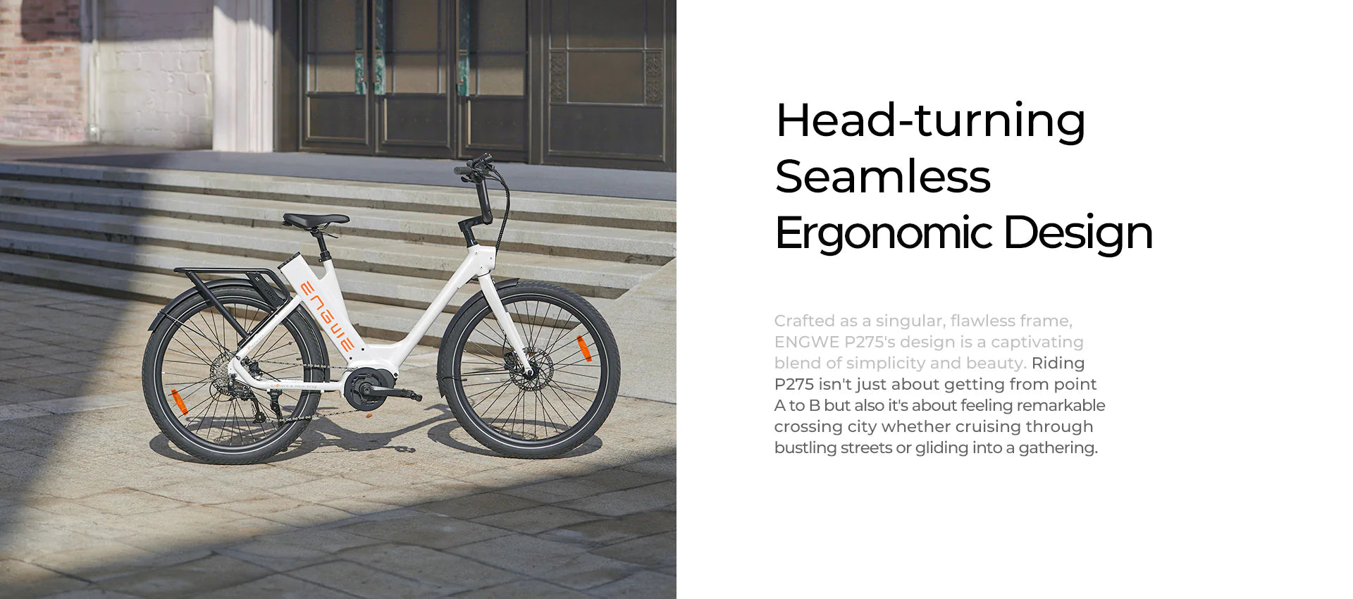 The ENGWE P275 ST is a step-through city e-bike equipped with a 250W mid-drive motor, 70Nm torque, and a 36V 19.2Ah Samsung battery offering up to 260km range. Designed for comfortable and efficient urban commuting.